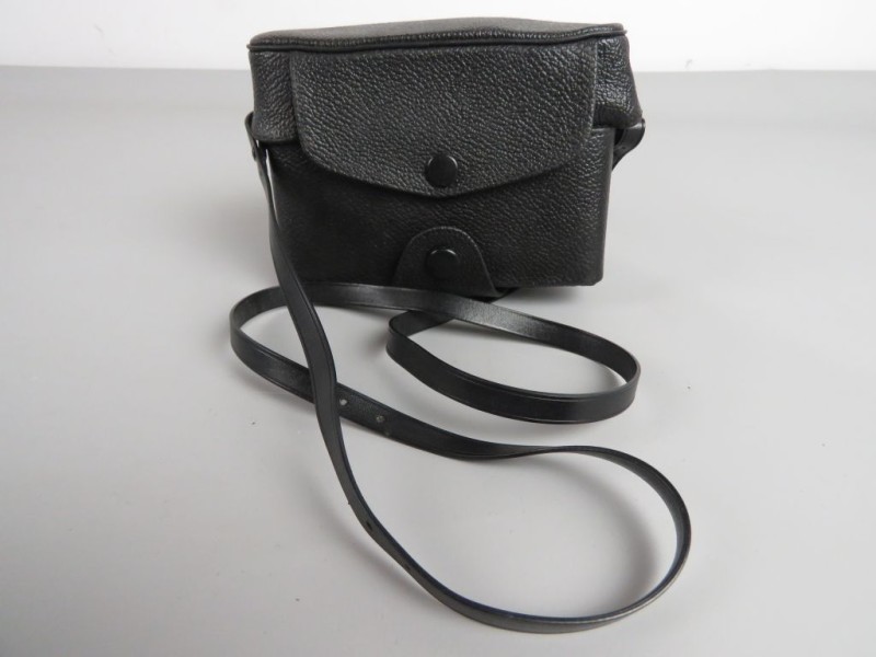 Draagtas/Paraattas: Een zwarte, gestructureerde (imitatie)leren tas met een bijpassende dunne schouderriem.