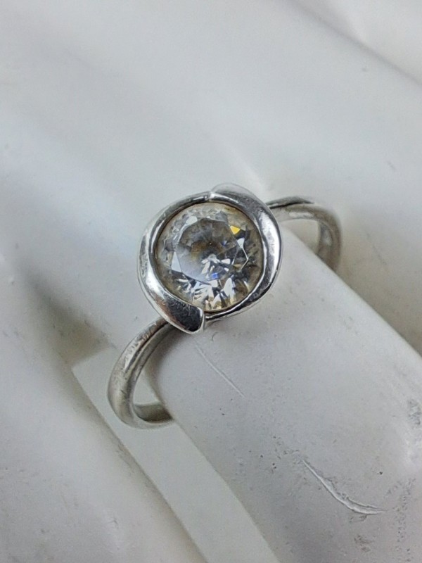 Deze sieradenset bestaat uit een zilveren ring en een paar bijpassende oorstekers. De ring heeft een moderne, ronde zetting met een grote transparante steen (vermoedelijk zirkonia of kristal). De oorstekers hebben elk een kleinere steen in een klassieke klauwzetting. Beide zijn uitgevoerd in 925 zilver, wat ook in de ring gegraveerd staat. De stijl is eenvoudig en elegant, passend bij dagelijks gebruik of als subtiel accent bij feestelijke kleding.