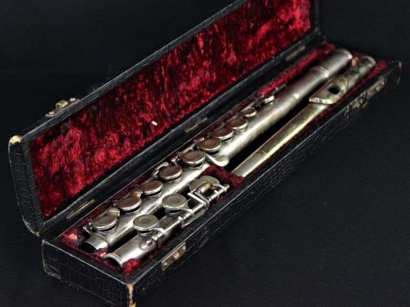 De dwarsfluit zit bewaard in een zwart koffertje dat bekleed is met rode stof.