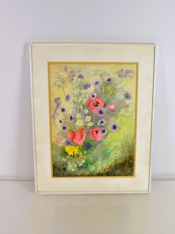 Originele aquarel van Leo Van Looy (Turnhout). Een zomers boeket met klaprozen, margrieten, korenbloemen en andere veldbloemen op een zachte groene achtergrond. De kleuren zijn levendig en natuurlijk. Het werk toont veel oog voor detail en een zachte penseeltoets. Gesigneerd linksonder “L.V. Looy”. Achteraan een originele infofiche met biografie, prijzen en tentoonstellingen. Dit werk is een unieke aquarel (geen reproductie), afkomstig uit het atelier van de kunstenaar zelf.