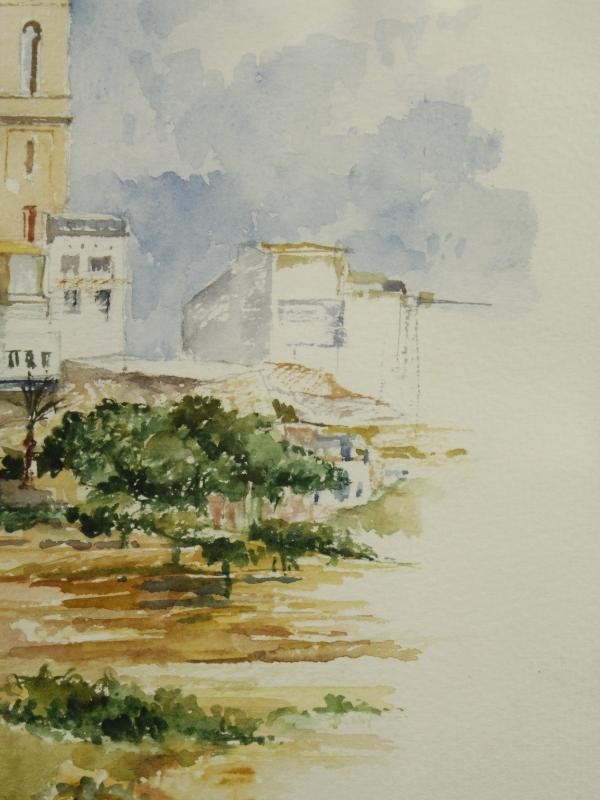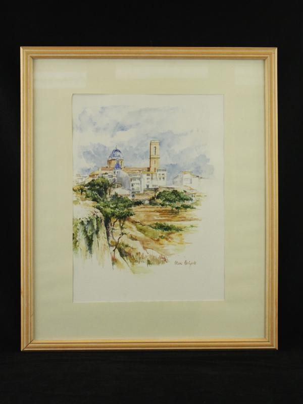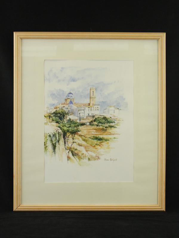 Dit zomerse aquarelschilderij met de titel “Altea Mirando Al Mar” toont een mediterraan stads- en landschapszicht, met op de achtergrond bebouwing en een kenmerkende kerkkoepel, en op de voorgrond een heuvelachtig landschap met bomen en vegetatie. Het werk is uitgevoerd op papier en rechts onderaan in verf gesigneerd door Marc Oorlynck (1954–2009).