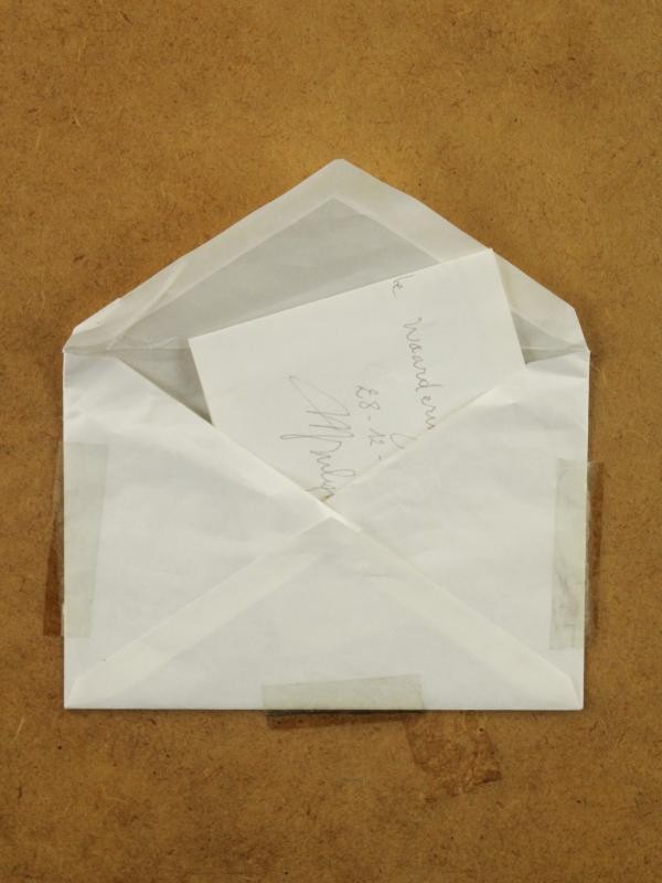 Achterzijde: enveloppe met kaartje met informatie over de kunstenaar en zijn tentoonstellingen, bevestigd aan de kader