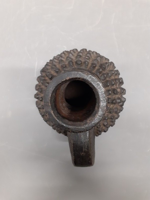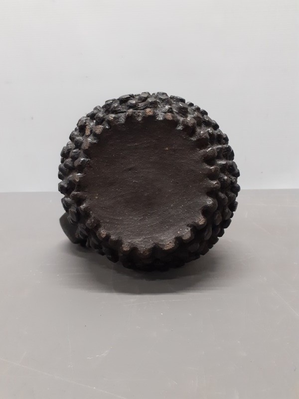 Karaktervolle keramische vaas met een robuuste uitstraling en een opvallende reliëfstructuur. De diepe, donkere kleur en het sculpturale ontwerp geven dit object een krachtige presence, waardoor het zowel als vaas als los decoratief kunstobject uitstekend tot zijn recht komt in een interieur met karakter. Mogelijks uit Ivoorkust.